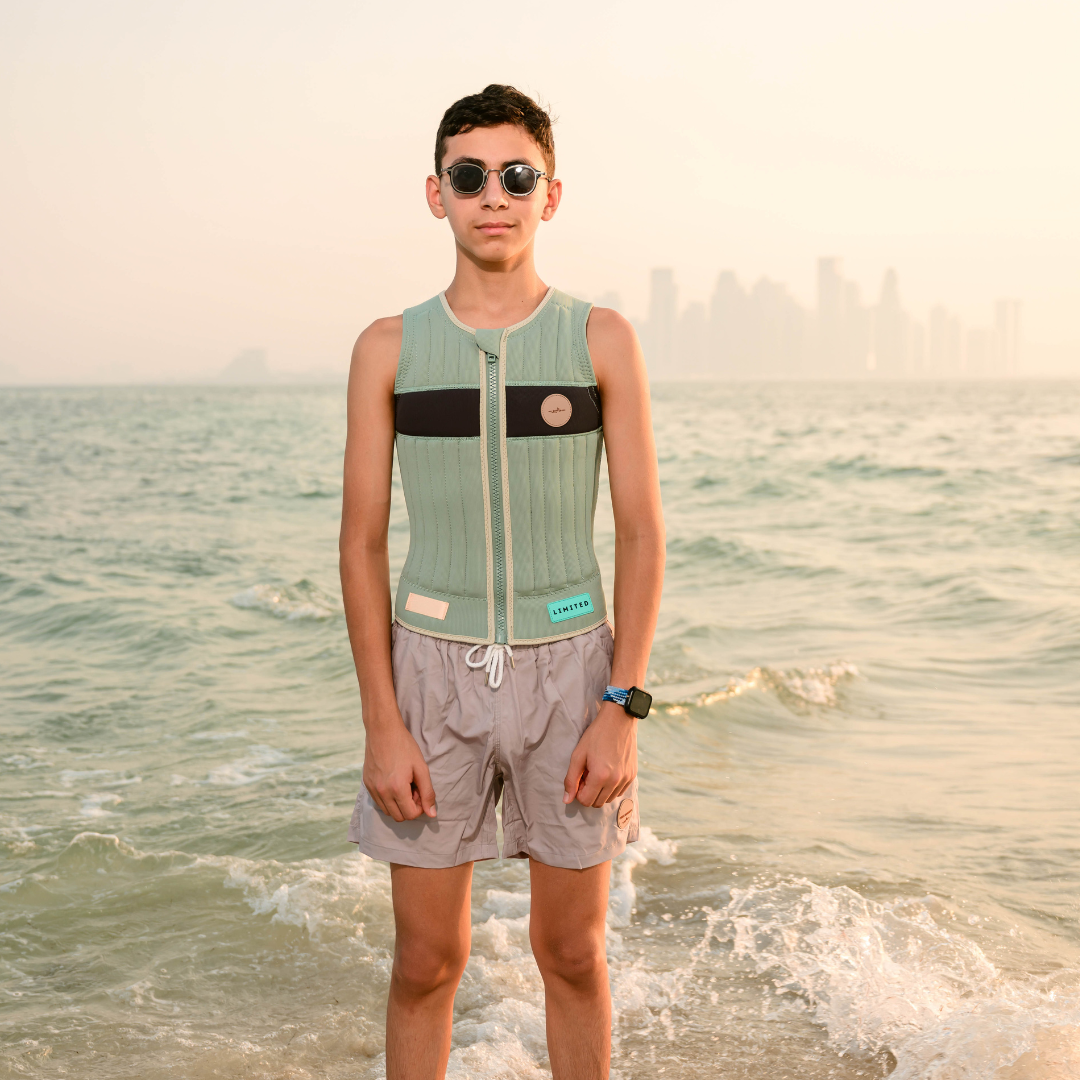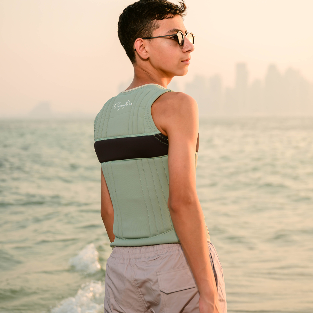 Elevate your watersport wardrobe with the Malibu Signature Watersport Vest, featuring a sleek pale green body complemented by a sophisticated black strip. This vest is constructed from high-quality neoprene, ensuring both optimal buoyancy and supreme comfort. Designed with an easy-to-use front zipper for a secure fit and a segmented pattern for unhampered movement, it's perfect for any aquatic sport. The vest showcases a distinctive 'Signature' script, marrying style with function. Additionally, it includes a practical beige webbing at the lower left, designed to keep your jet ski key secure and accessible. A mix of safety, style, and utility, this vest is an essential for the discerning water sports enthusiast.